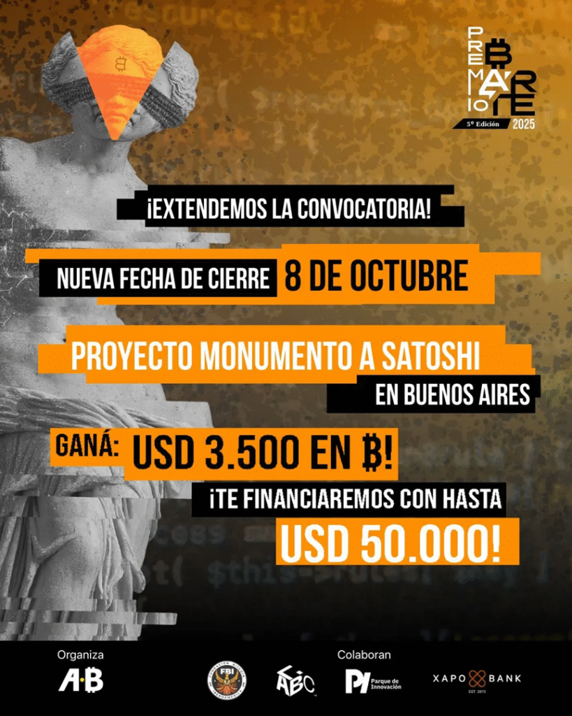 La ONG Bitcoin Argentina extiende hasta el 8 de octubre de 2025 el plazo de inscripción a artistas y creativos de todo el mundo para participar en la 5ª edición de Premio B·Arte, que busca el proyecto que se convertirá en el primer Monumento a Satoshi Nakamoto en Argentina, así como obras de arte físico y digital. Las obras y proyectos serán exhibidos en LABITCONF 2025, Buenos Aires